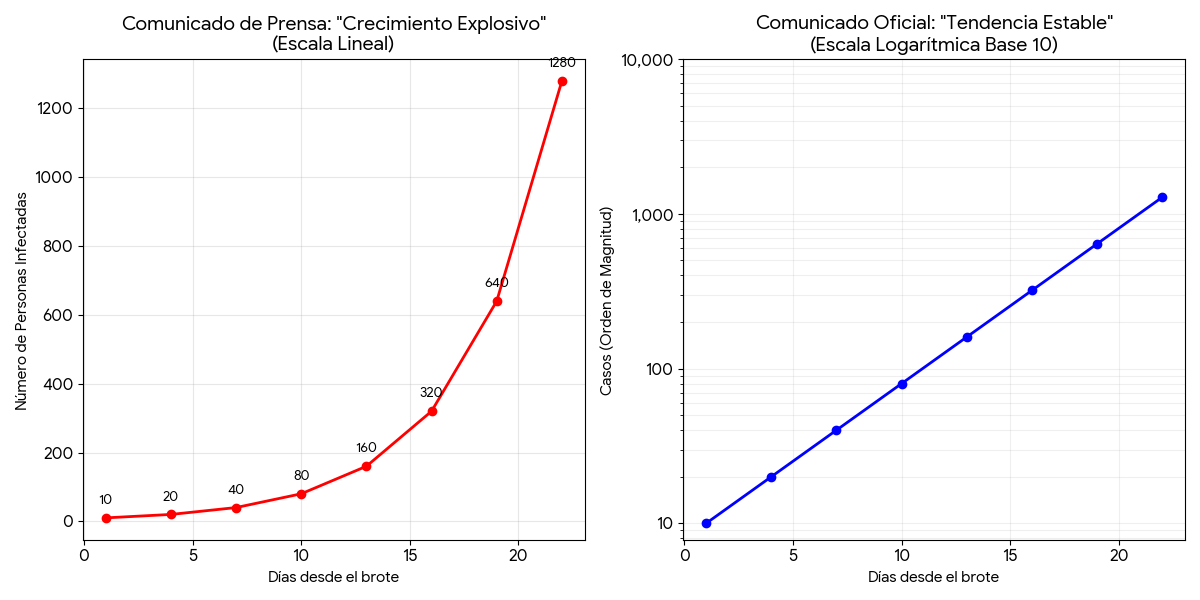La escala logarítmica puede ser útil cuando los datos crecen muy rápido o abarcan varios órdenes de magnitud. El problema aparece cuando se usa sin explicarla claramente, porque puede hacer que aumentos absolutos muy grandes parezcan visualmente más moderados. Así, un crecimiento explosivo podría interpretarse erróneamente como si fuera solo un crecimiento sostenido.